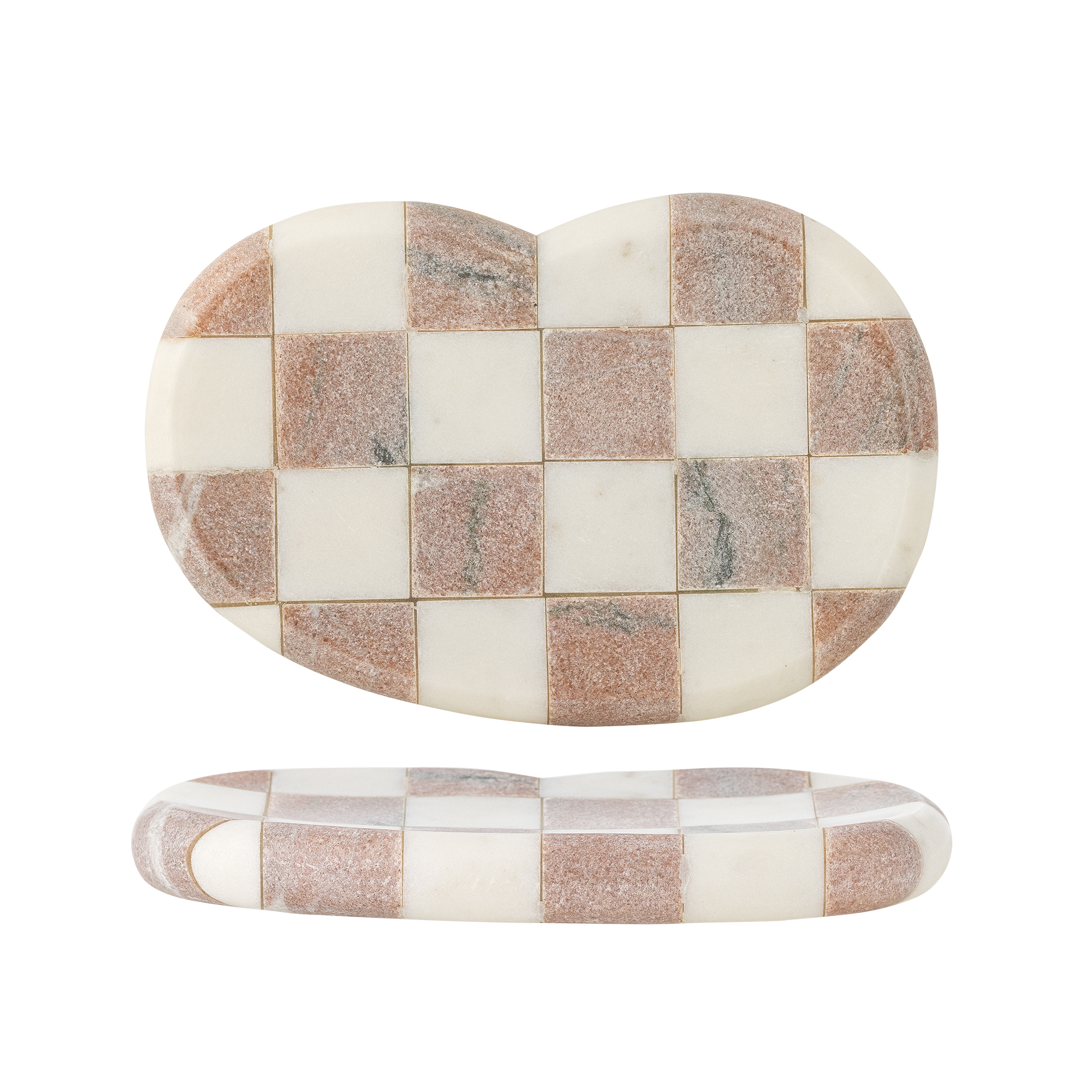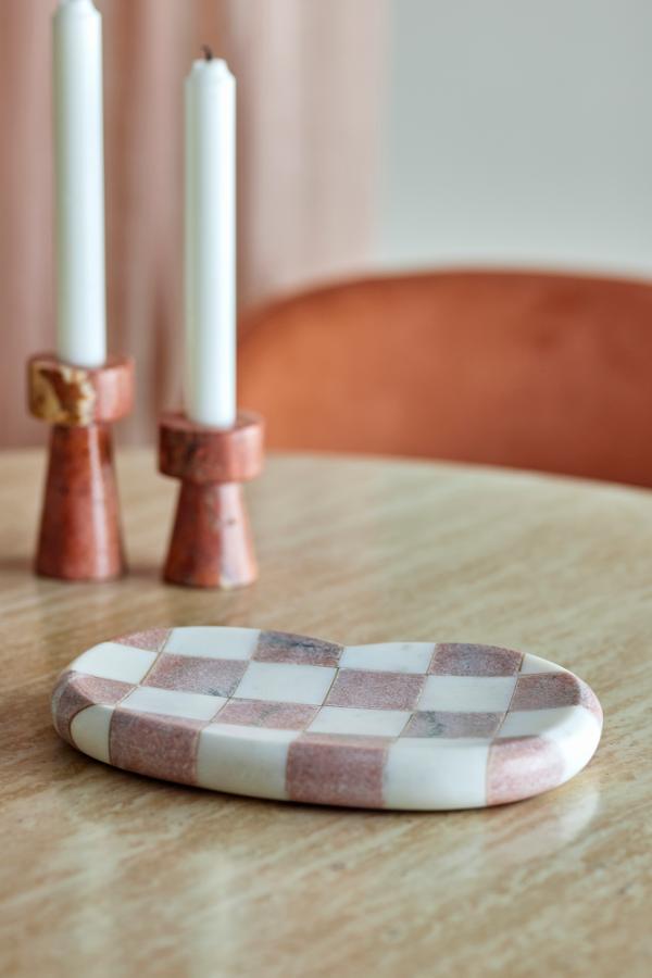 Deze marmeren schaal heeft een gepolijste afwerking, ontworpen met afwisselende roze en lichtbeige vierkantjes. Het heeft gladde, gebogen randen en fijne nerven. Het product is gemaakt van natuurlijke materialen – kleurvariaties kunnen voorkomen, waardoor elk exemplaar uniek is.