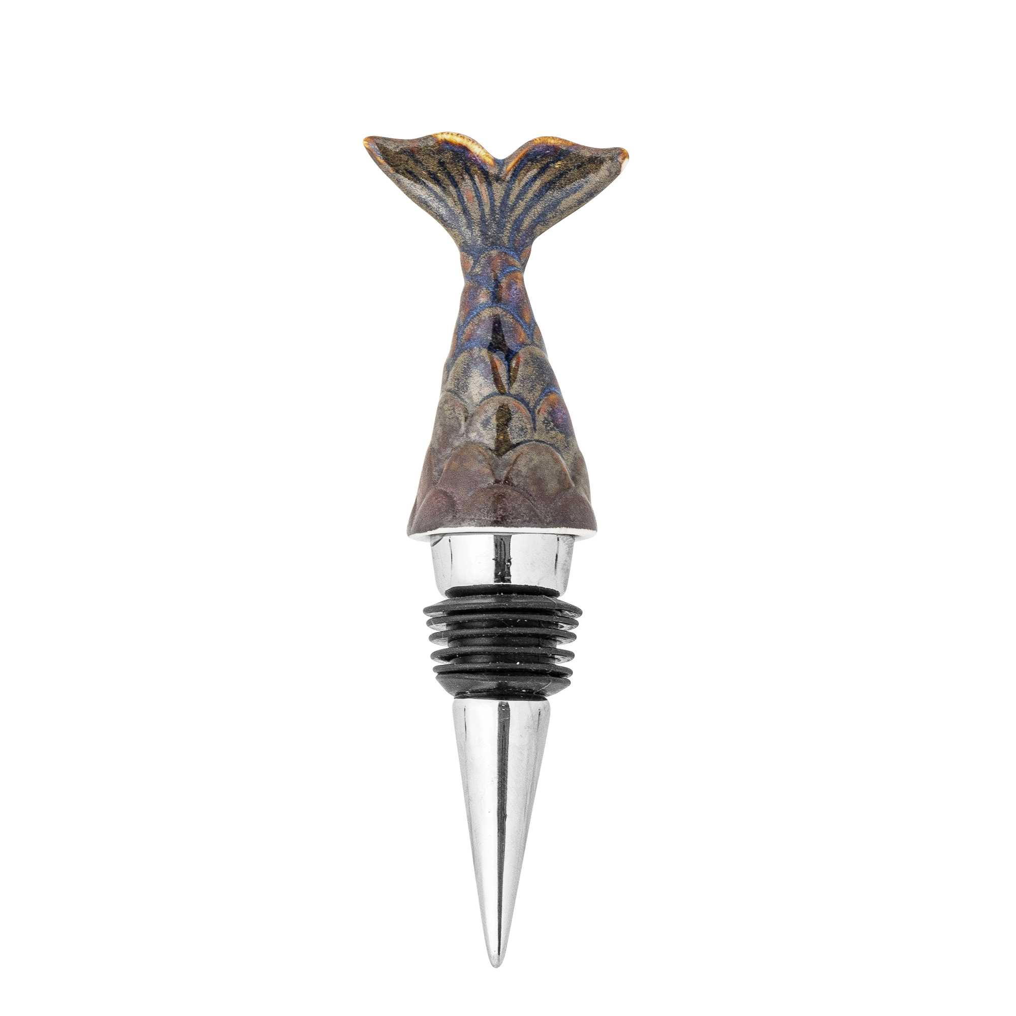 Deze wijnstopper heeft een visstaartversiering van geglazuurd keramiek.