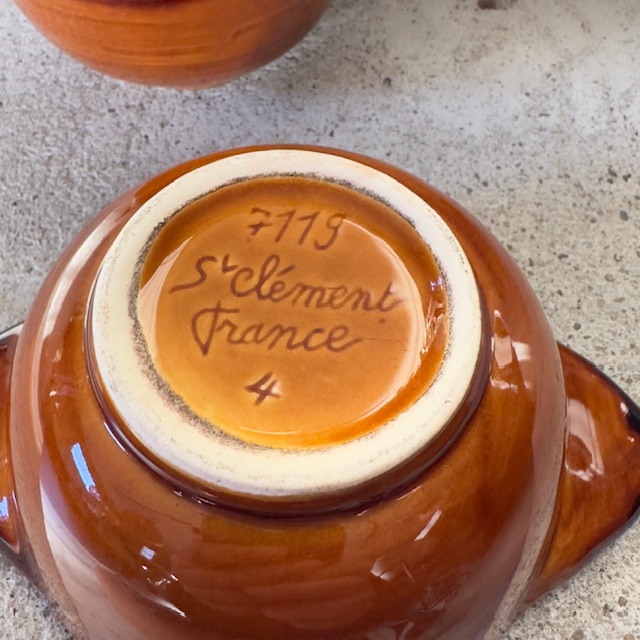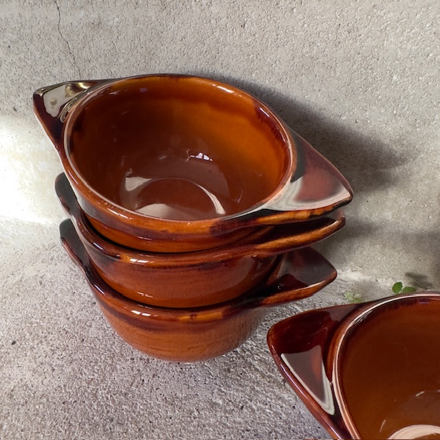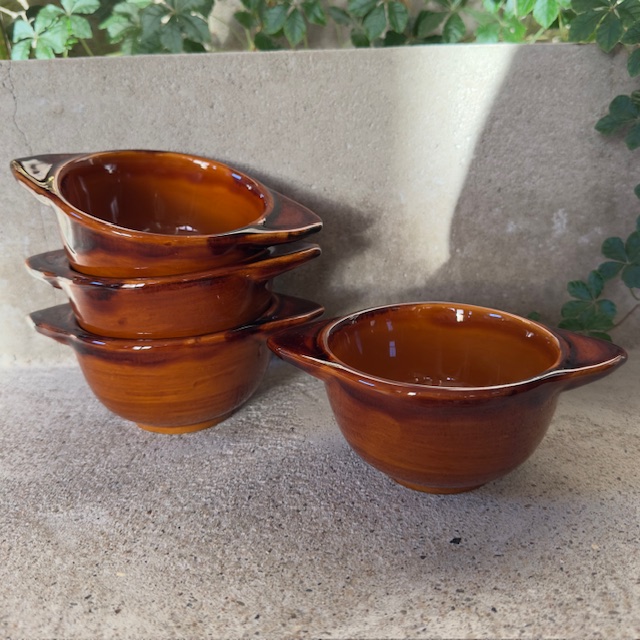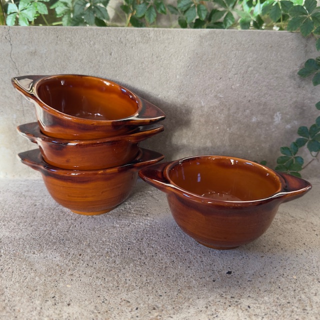 Setje van 4 vintage soepkommen in een retro bruine kleur met een fantastisch glazuur.