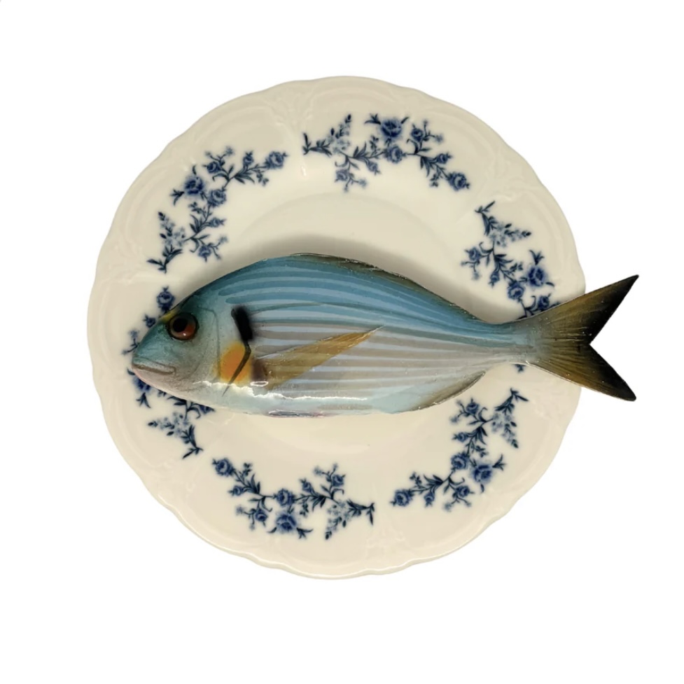 Prachtig gedetailleerd is dit Visbord Orata Medio op een Wit bord met blauw details