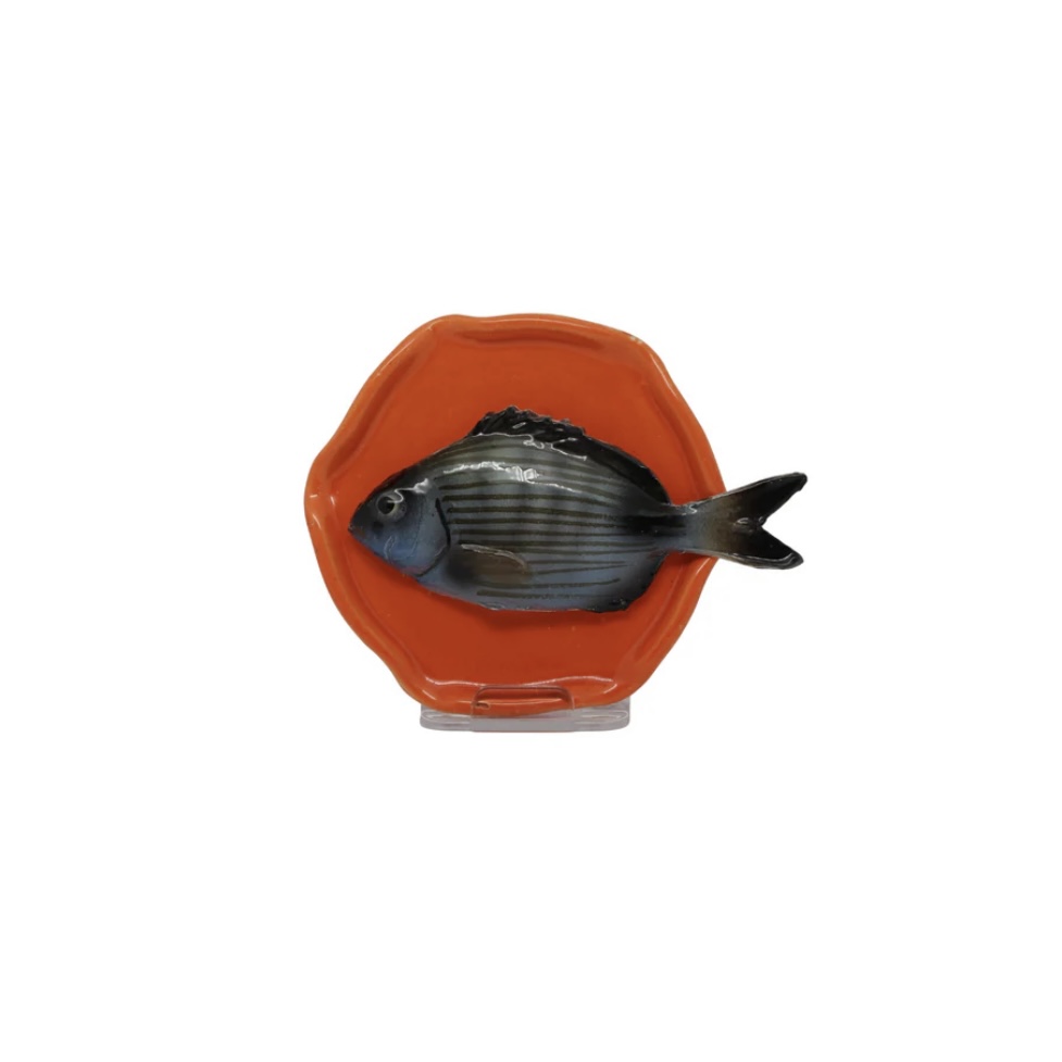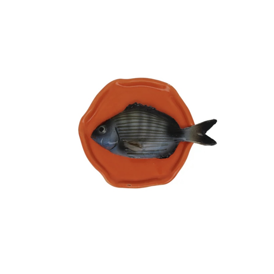 Prachtig gedetailleerd is dit Visbord Sarago Piccolo op een handmade oranje bordje.