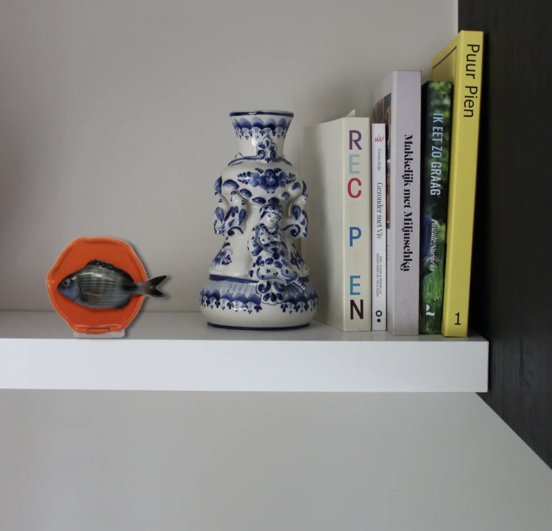 Doordat de staart over de rand heen steekt, kun je goed zien dat de vis een los object is.
