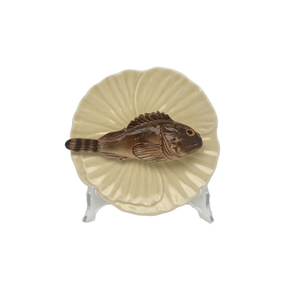 Prachtig gedetailleerd is dit Visbord Scorfano Marrone op een Geel Bladvormig Blad.